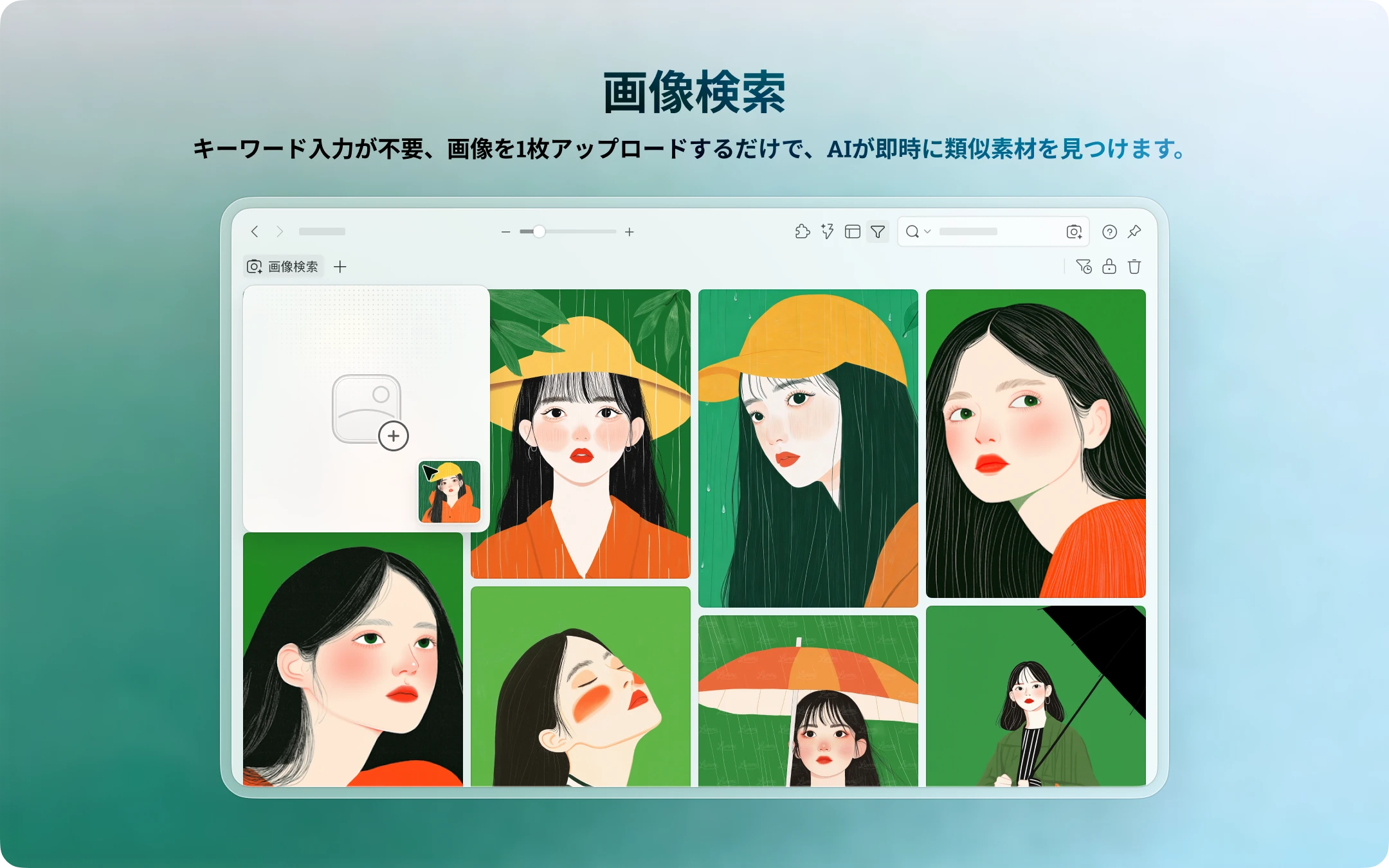 - セマンティック検索:「夕日のビーチ」や「青いグラデーション背景」など、自然言語で探したいものを記述すると、AI が意味を理解し、最も関連性の高い結果を返します。