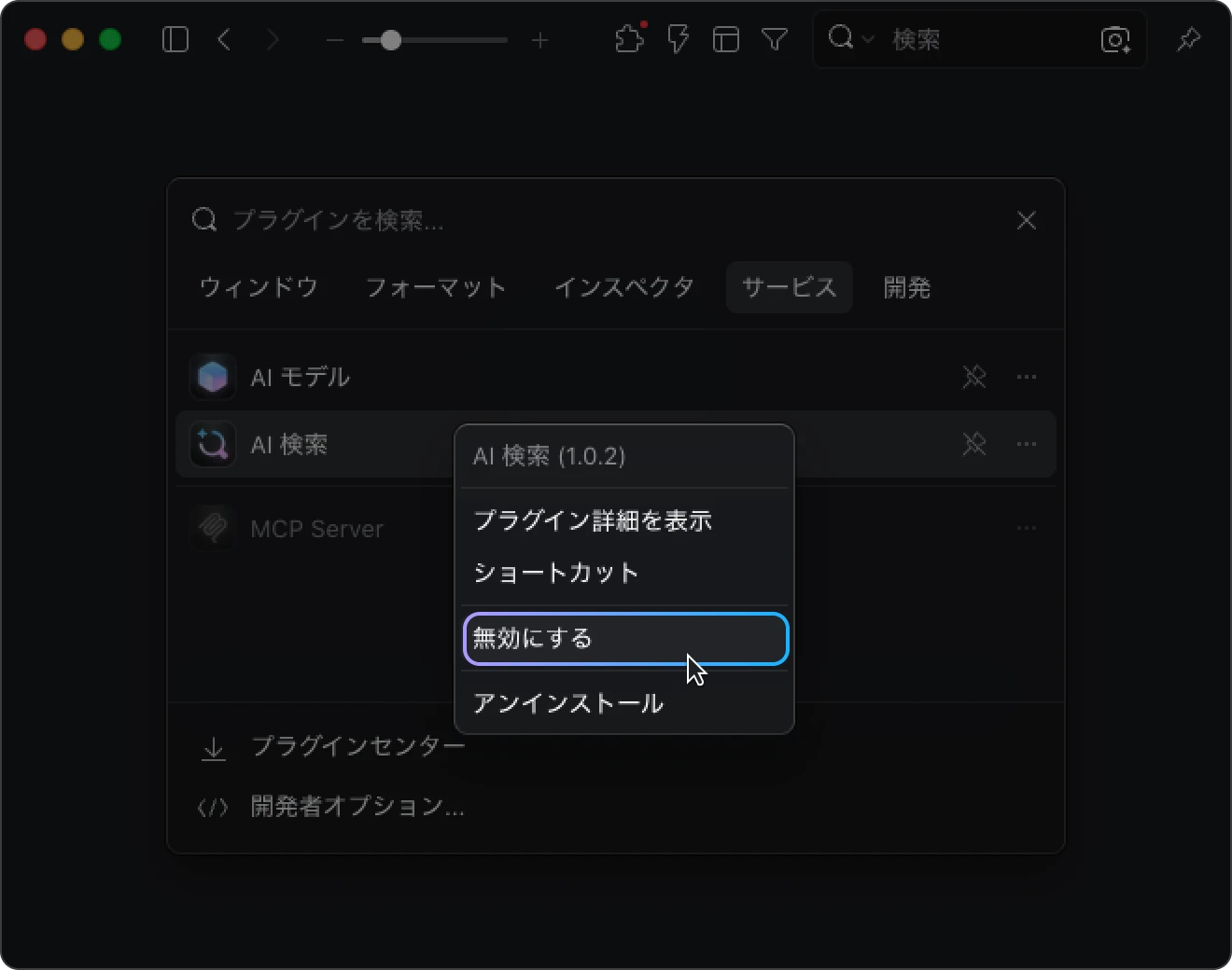 - 環境設定:サービス型プラグイン(AI 検索、AI モデルキット、MCP Server など)には専用のトグルスイッチを用意。無効時には有効化の案内が表示され、ワンクリックで復元できます。
